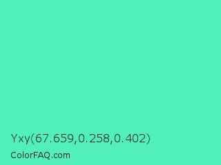 Yxy 67.659,0.258,0.402 Color is a light green color and the nearest color is Turquoise #40e0d0. Hex code #51f0ba and RGB value is rgb(81,240,186). In RGB color space, this color is composed of 32% red, 94% green, 73% blue, In CMYK color space, this color is composed of 66% cyan, 0% magenta, 23% yellow , 6% black , In HSL color space, this color has a hue angle of 160° , 84% saturation and 63% lightness.