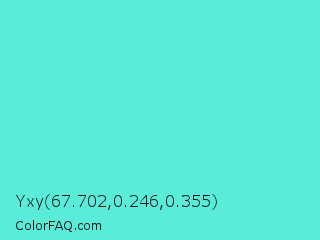 Yxy 67.702,0.246,0.355 Color is a light cyan color and the nearest color is Turquoise #40e0d0. Hex code #59edd9 and RGB value is rgb(89,237,217). In RGB color space, this color is composed of 35% red, 93% green, 85% blue, In CMYK color space, this color is composed of 62% cyan, 0% magenta, 8% yellow , 7% black , In HSL color space, this color has a hue angle of 172° , 80% saturation and 64% lightness.