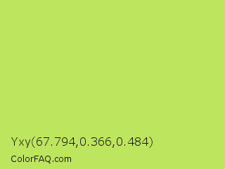 Yxy 67.794,0.366,0.484 Color is a light lime color and the nearest color is June Bud #bdda57. Hex code #bee55e and RGB value is rgb(190,229,94). In RGB color space, this color is composed of 75% red, 90% green, 37% blue, In CMYK color space, this color is composed of 17% cyan, 0% magenta, 59% yellow , 10% black , In HSL color space, this color has a hue angle of 77° , 72% saturation and 63% lightness.