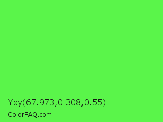 Yxy 67.973,0.308,0.55 Color is a light green color and the nearest color is Screamin Green #66ff66. Hex code #5af54a and RGB value is rgb(90,245,74). In RGB color space, this color is composed of 35% red, 96% green, 29% blue, In CMYK color space, this color is composed of 63% cyan, 0% magenta, 70% yellow , 4% black , In HSL color space, this color has a hue angle of 114° , 90% saturation and 63% lightness.