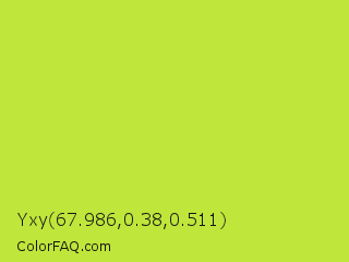 Yxy 67.986,0.38,0.511 Color is a normal lime color and the nearest color is Pear #d1e231. Hex code #bfe63a and RGB value is rgb(191,230,58). In RGB color space, this color is composed of 75% red, 90% green, 23% blue, In CMYK color space, this color is composed of 17% cyan, 0% magenta, 75% yellow , 10% black , In HSL color space, this color has a hue angle of 74° , 77% saturation and 56% lightness.
