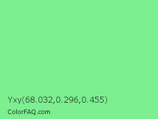 Yxy 68.032,0.296,0.455 Color is a light green color and the nearest color is Light Green #90ee90. Hex code #7cef90 and RGB value is rgb(124,239,144). In RGB color space, this color is composed of 49% red, 94% green, 56% blue, In CMYK color space, this color is composed of 48% cyan, 0% magenta, 40% yellow , 6% black , In HSL color space, this color has a hue angle of 130° , 78% saturation and 71% lightness.