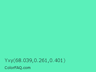 Yxy 68.039,0.261,0.401 Color is a light green color and the nearest color is Medium Aquamarine #66ddaa. Hex code #5af0ba and RGB value is rgb(90,240,186). In RGB color space, this color is composed of 35% red, 94% green, 73% blue, In CMYK color space, this color is composed of 63% cyan, 0% magenta, 23% yellow , 6% black , In HSL color space, this color has a hue angle of 158° , 83% saturation and 65% lightness.