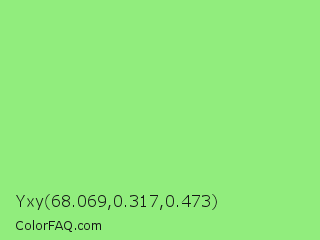 Yxy 68.069,0.317,0.473 Color is a light green color and the nearest color is Light Green #90ee90. Hex code #91ed7d and RGB value is rgb(145,237,125). In RGB color space, this color is composed of 57% red, 93% green, 49% blue, In CMYK color space, this color is composed of 39% cyan, 0% magenta, 47% yellow , 7% black , In HSL color space, this color has a hue angle of 109° , 76% saturation and 71% lightness.