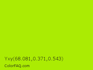 Yxy 68.081,0.371,0.543 Color is a normal lime color and the nearest color is Spring Bud #a7fc00. Hex code #abeb03 and RGB value is rgb(171,235,3). In RGB color space, this color is composed of 67% red, 92% green, 1% blue, In CMYK color space, this color is composed of 27% cyan, 0% magenta, 99% yellow , 8% black , In HSL color space, this color has a hue angle of 77° , 97% saturation and 47% lightness.