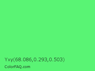 Yxy 68.086,0.293,0.503 Color is a light green color and the nearest color is Screamin Green #66ff66. Hex code #59f474 and RGB value is rgb(89,244,116). In RGB color space, this color is composed of 35% red, 96% green, 45% blue, In CMYK color space, this color is composed of 64% cyan, 0% magenta, 52% yellow , 4% black , In HSL color space, this color has a hue angle of 130° , 88% saturation and 65% lightness.