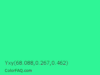 Yxy 68.088,0.267,0.462 Color is a normal green color and the nearest color is Eucalyptus #44d7a8. Hex code #30f596 and RGB value is rgb(48,245,150). In RGB color space, this color is composed of 19% red, 96% green, 59% blue, In CMYK color space, this color is composed of 80% cyan, 0% magenta, 39% yellow , 4% black , In HSL color space, this color has a hue angle of 151° , 91% saturation and 57% lightness.