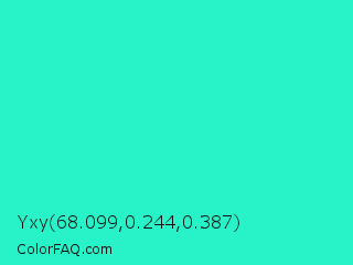 Yxy 68.099,0.244,0.387 Color is a normal cyan color and the nearest color is Turquoise PWG #30d5c8. Hex code #28f2c7 and RGB value is rgb(40,242,199). In RGB color space, this color is composed of 16% red, 95% green, 78% blue, In CMYK color space, this color is composed of 83% cyan, 0% magenta, 18% yellow , 5% black , In HSL color space, this color has a hue angle of 167° , 89% saturation and 55% lightness.