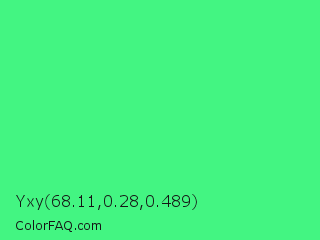 Yxy 68.11,0.28,0.489 Color is a light green color and the nearest color is Very Light Malachite Green #64e986. Hex code #43f582 and RGB value is rgb(67,245,130). In RGB color space, this color is composed of 26% red, 96% green, 51% blue, In CMYK color space, this color is composed of 73% cyan, 0% magenta, 47% yellow , 4% black , In HSL color space, this color has a hue angle of 141° , 90% saturation and 61% lightness.