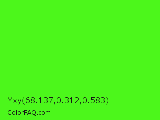 Yxy 68.137,0.312,0.583 Color is a normal green color and the nearest color is Neon Green #39ff14. Hex code #4cf71b and RGB value is rgb(76,247,27). In RGB color space, this color is composed of 30% red, 97% green, 11% blue, In CMYK color space, this color is composed of 69% cyan, 0% magenta, 89% yellow , 3% black , In HSL color space, this color has a hue angle of 107° , 93% saturation and 54% lightness.