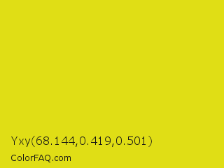 Yxy 68.144,0.419,0.501 Color is a normal yellow color and the nearest color is Piss Yellow #e1e115. Hex code #e0de15 and RGB value is rgb(224,222,21). In RGB color space, this color is composed of 88% red, 87% green, 8% blue, In CMYK color space, this color is composed of 0% cyan, 1% magenta, 91% yellow , 12% black , In HSL color space, this color has a hue angle of 59° , 83% saturation and 48% lightness.