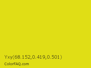 Yxy 68.152,0.419,0.501 Color is a normal yellow color and the nearest color is Piss Yellow #e1e115. Hex code #e0de15 and RGB value is rgb(224,222,21). In RGB color space, this color is composed of 88% red, 87% green, 8% blue, In CMYK color space, this color is composed of 0% cyan, 1% magenta, 91% yellow , 12% black , In HSL color space, this color has a hue angle of 59° , 83% saturation and 48% lightness.