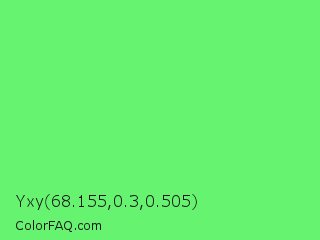 Yxy 68.155,0.3,0.505 Color is a light green color and the nearest color is Screamin Green #66ff66. Hex code #66f370 and RGB value is rgb(102,243,112). In RGB color space, this color is composed of 40% red, 95% green, 44% blue, In CMYK color space, this color is composed of 58% cyan, 0% magenta, 54% yellow , 5% black , In HSL color space, this color has a hue angle of 124° , 85% saturation and 68% lightness.