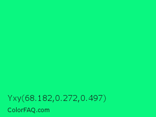 Yxy 68.182,0.272,0.497 Color is a normal green color and the nearest color is Spring Green #00ff7f. Hex code #0af780 and RGB value is rgb(10,247,128). In RGB color space, this color is composed of 4% red, 97% green, 50% blue, In CMYK color space, this color is composed of 96% cyan, 0% magenta, 48% yellow , 3% black , In HSL color space, this color has a hue angle of 150° , 94% saturation and 50% lightness.