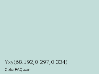 Yxy 68.192,0.297,0.334 Color is a very light cyan color and the nearest color is Edgewater #c8e3d7. Hex code #c2ddd9 and RGB value is rgb(194,221,217). In RGB color space, this color is composed of 76% red, 87% green, 85% blue, In CMYK color space, this color is composed of 12% cyan, 0% magenta, 2% yellow , 13% black , In HSL color space, this color has a hue angle of 171° , 28% saturation and 81% lightness.