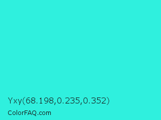 Yxy 68.198,0.235,0.352 Color is a normal cyan color and the nearest color is Turquoise #40e0d0. Hex code #2ff0de and RGB value is rgb(47,240,222). In RGB color space, this color is composed of 18% red, 94% green, 87% blue, In CMYK color space, this color is composed of 80% cyan, 0% magenta, 8% yellow , 6% black , In HSL color space, this color has a hue angle of 174° , 87% saturation and 56% lightness.