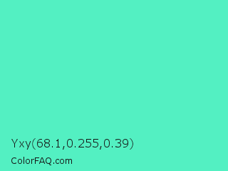 Yxy 68.1,0.255,0.39 Color is a light green color and the nearest color is Turquoise #40e0d0. Hex code #53f0c2 and RGB value is rgb(83,240,194). In RGB color space, this color is composed of 33% red, 94% green, 76% blue, In CMYK color space, this color is composed of 65% cyan, 0% magenta, 19% yellow , 6% black , In HSL color space, this color has a hue angle of 162° , 84% saturation and 63% lightness.