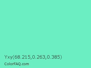 Yxy 68.215,0.263,0.385 Color is a light green color and the nearest color is Bermuda #7dd8c6. Hex code #6ceec3 and RGB value is rgb(108,238,195). In RGB color space, this color is composed of 42% red, 93% green, 76% blue, In CMYK color space, this color is composed of 55% cyan, 0% magenta, 18% yellow , 7% black , In HSL color space, this color has a hue angle of 160° , 79% saturation and 68% lightness.