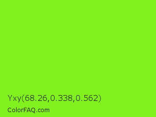 Yxy 68.26,0.338,0.562 Color is a normal green color and the nearest color is Spring Frost #87ff2a. Hex code #81f21d and RGB value is rgb(129,242,29). In RGB color space, this color is composed of 51% red, 95% green, 11% blue, In CMYK color space, this color is composed of 47% cyan, 0% magenta, 88% yellow , 5% black , In HSL color space, this color has a hue angle of 92° , 89% saturation and 53% lightness.