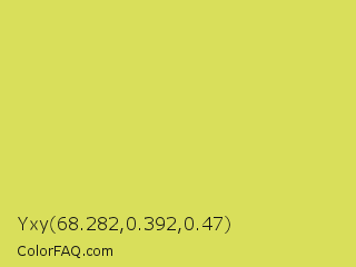 Yxy 68.282,0.392,0.47 Color is a light yellow color and the nearest color is Maximum Green Yellow #d9e650. Hex code #d9df5b and RGB value is rgb(217,223,91). In RGB color space, this color is composed of 85% red, 87% green, 36% blue, In CMYK color space, this color is composed of 3% cyan, 0% magenta, 59% yellow , 13% black , In HSL color space, this color has a hue angle of 63° , 67% saturation and 62% lightness.