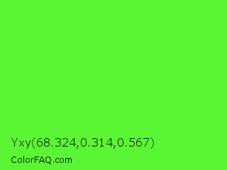 Yxy 68.324,0.314,0.567 Color is a normal green color and the nearest color is Spring Frost #87ff2a. Hex code #5bf633 and RGB value is rgb(91,246,51). In RGB color space, this color is composed of 36% red, 96% green, 20% blue, In CMYK color space, this color is composed of 63% cyan, 0% magenta, 79% yellow , 4% black , In HSL color space, this color has a hue angle of 108° , 92% saturation and 58% lightness.