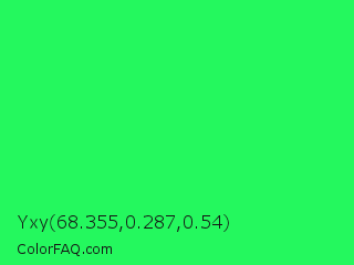Yxy 68.355,0.287,0.54 Color is a normal green color and the nearest color is Malachite #0bda51. Hex code #24f85e and RGB value is rgb(36,248,94). In RGB color space, this color is composed of 14% red, 97% green, 37% blue, In CMYK color space, this color is composed of 85% cyan, 0% magenta, 62% yellow , 3% black , In HSL color space, this color has a hue angle of 136° , 94% saturation and 56% lightness.