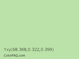 Yxy 68.368,0.322,0.399 Color is a light green color and the nearest color is Moss Green #addfad. Hex code #bbe3a9 and RGB value is rgb(187,227,169). In RGB color space, this color is composed of 73% red, 89% green, 66% blue, In CMYK color space, this color is composed of 18% cyan, 0% magenta, 26% yellow , 11% black , In HSL color space, this color has a hue angle of 101° , 51% saturation and 78% lightness.