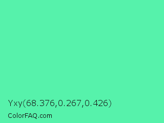 Yxy 68.376,0.267,0.426 Color is a light green color and the nearest color is Medium Aquamarine #66ddaa. Hex code #56f2ab and RGB value is rgb(86,242,171). In RGB color space, this color is composed of 34% red, 95% green, 67% blue, In CMYK color space, this color is composed of 64% cyan, 0% magenta, 29% yellow , 5% black , In HSL color space, this color has a hue angle of 153° , 86% saturation and 64% lightness.