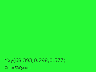 Yxy 68.393,0.298,0.577 Color is a normal green color and the nearest color is Neon Green #39ff14. Hex code #26f936 and RGB value is rgb(38,249,54). In RGB color space, this color is composed of 15% red, 98% green, 21% blue, In CMYK color space, this color is composed of 85% cyan, 0% magenta, 78% yellow , 2% black , In HSL color space, this color has a hue angle of 125° , 95% saturation and 56% lightness.
