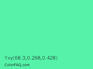 Yxy 68.3,0.268,0.428 Color is a light green color and the nearest color is Medium Aquamarine #66ddaa. Hex code #56f2a9 and RGB value is rgb(86,242,169). In RGB color space, this color is composed of 34% red, 95% green, 66% blue, In CMYK color space, this color is composed of 64% cyan, 0% magenta, 30% yellow , 5% black , In HSL color space, this color has a hue angle of 152° , 86% saturation and 64% lightness.