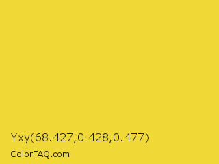 Yxy 68.427,0.428,0.477 Color is a normal yellow color and the nearest color is Sandstorm #ecd540. Hex code #f0d937 and RGB value is rgb(240,217,55). In RGB color space, this color is composed of 94% red, 85% green, 22% blue, In CMYK color space, this color is composed of 0% cyan, 10% magenta, 77% yellow , 6% black , In HSL color space, this color has a hue angle of 53° , 86% saturation and 58% lightness.