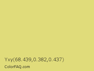 Yxy 68.439,0.382,0.437 Color is a light yellow color and the nearest color is Straw #e4d96f. Hex code #e0dc7a and RGB value is rgb(224,220,122). In RGB color space, this color is composed of 88% red, 86% green, 48% blue, In CMYK color space, this color is composed of 0% cyan, 2% magenta, 46% yellow , 12% black , In HSL color space, this color has a hue angle of 58° , 62% saturation and 68% lightness.