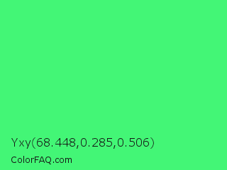 Yxy 68.448,0.285,0.506 Color is a light green color and the nearest color is Very Light Malachite Green #64e986. Hex code #43f676 and RGB value is rgb(67,246,118). In RGB color space, this color is composed of 26% red, 96% green, 46% blue, In CMYK color space, this color is composed of 73% cyan, 0% magenta, 52% yellow , 4% black , In HSL color space, this color has a hue angle of 137° , 91% saturation and 61% lightness.