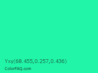 Yxy 68.455,0.257,0.436 Color is a normal green color and the nearest color is Medium Spring Green #00fa9a. Hex code #21f5a8 and RGB value is rgb(33,245,168). In RGB color space, this color is composed of 13% red, 96% green, 66% blue, In CMYK color space, this color is composed of 87% cyan, 0% magenta, 31% yellow , 4% black , In HSL color space, this color has a hue angle of 158° , 91% saturation and 55% lightness.