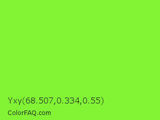 Yxy 68.507,0.334,0.55 Color is a normal green color and the nearest color is Spring Frost #87ff2a. Hex code #82f235 and RGB value is rgb(130,242,53). In RGB color space, this color is composed of 51% red, 95% green, 21% blue, In CMYK color space, this color is composed of 46% cyan, 0% magenta, 78% yellow , 5% black , In HSL color space, this color has a hue angle of 96° , 88% saturation and 58% lightness.