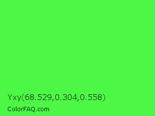 Yxy 68.529,0.304,0.558 Color is a light green color and the nearest color is Screamin Green #66ff66. Hex code #4cf745 and RGB value is rgb(76,247,69). In RGB color space, this color is composed of 30% red, 97% green, 27% blue, In CMYK color space, this color is composed of 69% cyan, 0% magenta, 72% yellow , 3% black , In HSL color space, this color has a hue angle of 118° , 92% saturation and 62% lightness.