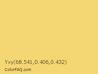 Yxy 68.541,0.406,0.432 Color is a light yellow color and the nearest color is Orange Yellow #f8d568. Hex code #f4d672 and RGB value is rgb(244,214,114). In RGB color space, this color is composed of 96% red, 84% green, 45% blue, In CMYK color space, this color is composed of 0% cyan, 12% magenta, 53% yellow , 4% black , In HSL color space, this color has a hue angle of 46° , 86% saturation and 70% lightness.