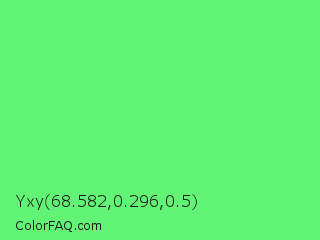 Yxy 68.582,0.296,0.5 Color is a light green color and the nearest color is Screamin Green #66ff66. Hex code #62f475 and RGB value is rgb(98,244,117). In RGB color space, this color is composed of 38% red, 96% green, 46% blue, In CMYK color space, this color is composed of 60% cyan, 0% magenta, 52% yellow , 4% black , In HSL color space, this color has a hue angle of 128° , 87% saturation and 67% lightness.