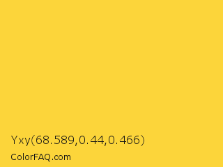 Yxy 68.589,0.44,0.466 Color is a light yellow color and the nearest color is Bright Sun #fed33c. Hex code #fcd53a and RGB value is rgb(252,213,58). In RGB color space, this color is composed of 99% red, 84% green, 23% blue, In CMYK color space, this color is composed of 0% cyan, 15% magenta, 77% yellow , 1% black , In HSL color space, this color has a hue angle of 48° , 97% saturation and 61% lightness.