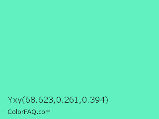 Yxy 68.623,0.261,0.394 Color is a light green color and the nearest color is Medium Aquamarine #66ddaa. Hex code #61f0bf and RGB value is rgb(97,240,191). In RGB color space, this color is composed of 38% red, 94% green, 75% blue, In CMYK color space, this color is composed of 60% cyan, 0% magenta, 20% yellow , 6% black , In HSL color space, this color has a hue angle of 159° , 83% saturation and 66% lightness.