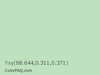 Yxy 68.644,0.311,0.371 Color is a very light green color and the nearest color is Surf #bbd7c1. Hex code #bee1be and RGB value is rgb(190,225,190). In RGB color space, this color is composed of 75% red, 88% green, 75% blue, In CMYK color space, this color is composed of 16% cyan, 0% magenta, 16% yellow , 12% black , In HSL color space, this color has a hue angle of 120° , 37% saturation and 81% lightness.