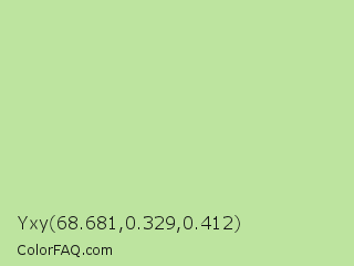 Yxy 68.681,0.329,0.412 Color is a light green color and the nearest color is Granny Smith Apple #a8e4a0. Hex code #bde49f and RGB value is rgb(189,228,159). In RGB color space, this color is composed of 74% red, 89% green, 62% blue, In CMYK color space, this color is composed of 17% cyan, 0% magenta, 30% yellow , 11% black , In HSL color space, this color has a hue angle of 94° , 56% saturation and 76% lightness.