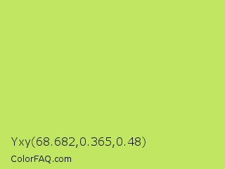 Yxy 68.682,0.365,0.48 Color is a light lime color and the nearest color is Inchworm #b2ec5d. Hex code #c0e662 and RGB value is rgb(192,230,98). In RGB color space, this color is composed of 75% red, 90% green, 38% blue, In CMYK color space, this color is composed of 17% cyan, 0% magenta, 57% yellow , 10% black , In HSL color space, this color has a hue angle of 77° , 73% saturation and 64% lightness.