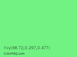 Yxy 68.72,0.297,0.477 Color is a light green color and the nearest color is Very Light Malachite Green #64e986. Hex code #72f283 and RGB value is rgb(114,242,131). In RGB color space, this color is composed of 45% red, 95% green, 51% blue, In CMYK color space, this color is composed of 53% cyan, 0% magenta, 46% yellow , 5% black , In HSL color space, this color has a hue angle of 128° , 83% saturation and 70% lightness.