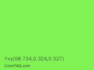 Yxy 68.734,0.324,0.527 Color is a light green color and the nearest color is Kiwi #8ee53f. Hex code #80f254 and RGB value is rgb(128,242,84). In RGB color space, this color is composed of 50% red, 95% green, 33% blue, In CMYK color space, this color is composed of 47% cyan, 0% magenta, 65% yellow , 5% black , In HSL color space, this color has a hue angle of 103° , 86% saturation and 64% lightness.