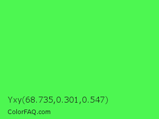Yxy 68.735,0.301,0.547 Color is a light green color and the nearest color is Screamin Green #66ff66. Hex code #4df751 and RGB value is rgb(77,247,81). In RGB color space, this color is composed of 30% red, 97% green, 32% blue, In CMYK color space, this color is composed of 69% cyan, 0% magenta, 67% yellow , 3% black , In HSL color space, this color has a hue angle of 121° , 91% saturation and 64% lightness.