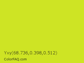 Yxy 68.736,0.398,0.512 Color is a normal yellow color and the nearest color is Pear #d1e231. Hex code #cee424 and RGB value is rgb(206,228,36). In RGB color space, this color is composed of 81% red, 89% green, 14% blue, In CMYK color space, this color is composed of 10% cyan, 0% magenta, 84% yellow , 11% black , In HSL color space, this color has a hue angle of 67° , 78% saturation and 52% lightness.