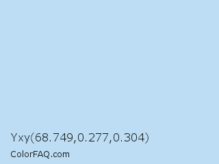 Yxy 68.749,0.277,0.304 Color is a very light blue color and the nearest color is Sail #b8e0f9. Hex code #bcddf3 and RGB value is rgb(188,221,243). In RGB color space, this color is composed of 74% red, 87% green, 95% blue, In CMYK color space, this color is composed of 23% cyan, 9% magenta, 0% yellow , 5% black , In HSL color space, this color has a hue angle of 204° , 70% saturation and 85% lightness.