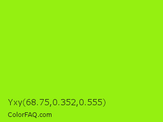 Yxy 68.75,0.352,0.555 Color is a normal green color and the nearest color is Spring Bud #a7fc00. Hex code #95f011 and RGB value is rgb(149,240,17). In RGB color space, this color is composed of 58% red, 94% green, 7% blue, In CMYK color space, this color is composed of 38% cyan, 0% magenta, 93% yellow , 6% black , In HSL color space, this color has a hue angle of 84° , 88% saturation and 50% lightness.