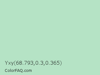 Yxy 68.793,0.3,0.365 Color is a light green color and the nearest color is Fringy Flower #b1e2c1. Hex code #b5e3c5 and RGB value is rgb(181,227,197). In RGB color space, this color is composed of 71% red, 89% green, 77% blue, In CMYK color space, this color is composed of 20% cyan, 0% magenta, 13% yellow , 11% black , In HSL color space, this color has a hue angle of 141° , 45% saturation and 80% lightness.